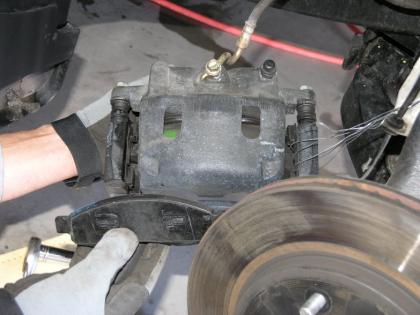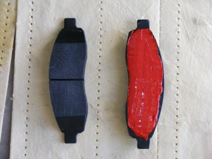 Note: Nissan says you need to replace these bolts with new ones. P/N 41005-7S000. My dealer charged me $9.80 each and there are (2) of them used on each caliper mount. If you decide to reused the old plots, Nissan's notes indicate you can do so after a good cleaning and application of loctite before reuse. 5. Once the caliper assembly has been removed and suspended, remove the clips securing the pads and removed the stock brake pads from the calipers. 6. Before taking the time to clean the suspension area, I planned to apply "Anti-Squeak" compound to the back of each of the new pads supplied with the kit. This is a step worth doing now and taking the time to do it correctly. Since brake squeak is not only annoying, it really annoying if you have to take the system apart again should your truck develop brake squeak. Like my grandfather use to tell me "...There's never enough time to do things right the first time but, there's always enough time to do things again, and again, and again." Following the directions of the product you select, apply anti-squeak compound to the backside of each of the kit brake pads. Following the manufactures instructions to give the product time to dry before attempting to install the pads.