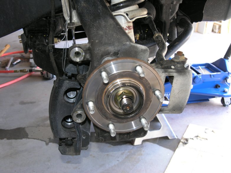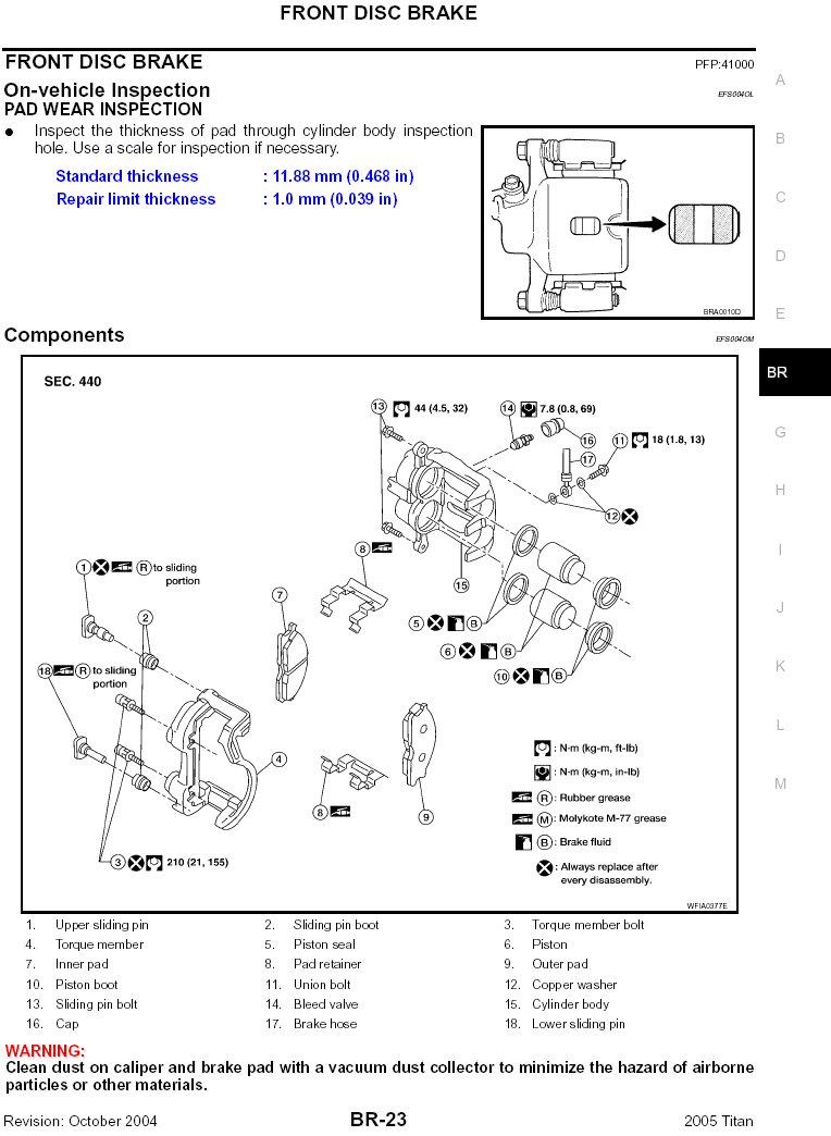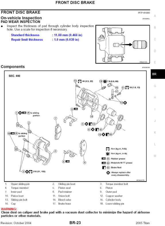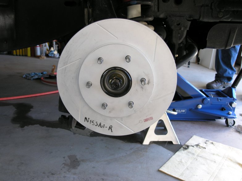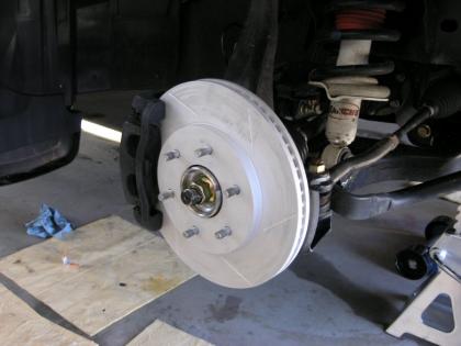 Recently I purchased a new Titan truck to replace my ageing Dodge Dakota. It wasn't to long before I started having a problem with my brakes that I had experienced with my Dodge. "Brake Judder". You know the problem. Every time you step hard on the brakes the whole vehicle begins to shake. Thinking back on it for a minute, I remembered contacting a company in California who had a different idea on extending brakes life. I had put a set of their brakes on my Dakota and they were still on the vehicle when I sold it! The only problem, remembering their name let alone if they were still in business today. Fortunately, one day, I was going thought one of the new Titan forums when I ran across a thread talking about brake problems and there they were, Applied Rotor Technology (ART). What luck. The next day I picked up the phone and got in touch with them again. Speaking with one of the owners, I found out that the company had changed hands. It turned out years earlier, when I was in touch with ART for brakes for my Dakota, I had been speaking to the new owner's nephew. Steve and his partner, Pad, told me they can build brakes for any disc brake equipped vehicle. Naturally, I asked about brakes for the Titans. Steve told me they were trying to help Titan and Armada owners over come these brake problems but, many owners were just taking the simple route, take it back to the dealer. Only problem is, after a few thousand miles, the judder is back again. Sure, I know, take it back to the dealer. Right? They'll fix it under warranty but, who wants to take a day off of work and spend it at the dealer only to have the problem re-surface again after a few thousand miles? During our conversation, Steve told me of an owner, in Riverside California, who's dealer had informed him after six brake warranty claims, the dealer would not cover it anymore. This owner had had six set of brakes installed in just nine months! Wow! I'm glad I not him... Well to make a long story short, ART sent me one of their Titan front rotor kits. I decided to document the project after ART told me they where always looking for customer projects for their website. So, I hope you'll enjoy my installation outline as much as I enjoyed doing it. Dave. Note: Although this job doesn't take long to perform, I do recommend using a solid and level area of your garage for this project. I started by parking my Titan in the center of the area I cleared. This way, there is enough room to move from either side to finish without having to down-jack the truck before finishing the project. Make sure the ignition is OFF and your wheel chocks are nearby too. Safety first. 1. I started by using a barker-bar to loosen the Titan's 21mm (13/16”) Lug-nuts on both front wheels before placing the truck on my jack-stands. If you do this step first, you will not have to have someone standing on the brake peddle while you fight to loosen them on the stands. 2. Next, using my hydraulic jack, I looked for and found a solid location in the center for the cross member and lifted the front of the truck high enough place my jack-stands at either end of the cross member. 3. Now, remove the six (6) 21mm lug nuts from each of your trucks wheels, place them in a safe place and remove the wheels. 4. In this step I'll remove the brakes calipers but, before I do so, I 'm going to place a small length of wire nearby so I can rig them out of the way before removing them. If you don't use this wire or some other item, like a tie-wrap, you'll have your calipers hanging by the brake lines and I don't recommend this. Now, remove the two (2) 21mm “Torque Member Bolts”. (noted as item #3 on Nissan's illustration notes). Also, for your information, when I removed these bolts, they were tight all the way to removal. This is common. After removing the bolts, secure the caliper assembly to a convenient spot, on the suspension, with that length of wire so the rubber brake line is not supporting the weight of the assembly. You don't want to risk damaging your brake lines.